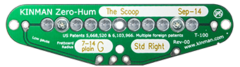 Tech stuff: The Gen-2 models have taller magnets and taller coil with Kinman’s patented magnetic focusing device incorporated. In concert with a squashed 600 Ohm hum-sensing coil all these new features produces non-aged sound. As of 10-Sep-2018 the pickups that have narrow and intermediate magnet spreads incorporate our new Gen-2+ technology which restores the slight but noticeable loss of attack & presence when the magnets are placed closer together to align with strings off a narrow spaced twin Pivot bridge. More technical info below.